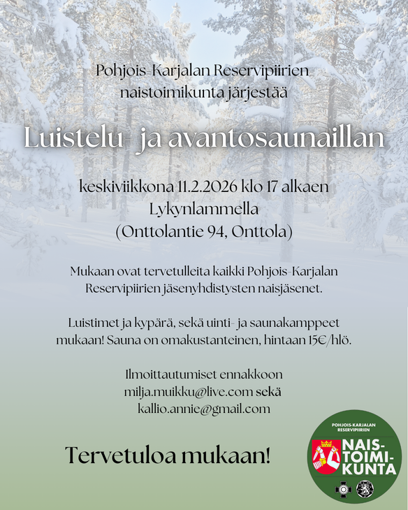 Mukaan ovat tervetulleita kaikki Pohjois-Karjalan Reservipiirien jäsenyhdistysten naisjäsenet. Eli sinun ei tarvitse liittyä erikseen naistoimikuntaan, vaan toimintaan pääsee mukaan oman reserviyhdistyksen kautta!
